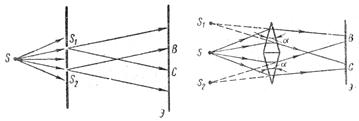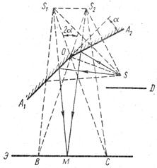 Зеркала Френеля. Используются два плоских зеркала А1О и А2О, угол между плоскостями которых очень мал. Свет, идущий от источника S, после отражения от обоих зеркал, распространяется в виде двух пучков с центрами S 1 и S 2, являющимися мнимыми изображениями источника S в зеркалах. Эти пучки при определенных условиях когерентны и при наложении дают на экране интерференционную картину (область ВС).