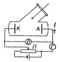 Свет освещает катод К, изготовленный из исследуемого металла. Электроны, испущенные катодом, перемещаются под действием электрического поля к аноду А, в результате в цепи фотоэлемента течет фототок I, измеряемый гальванометром Г. Напряжение между анодом и катодом можно изменять потенциометром П.