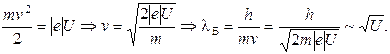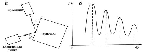 носит не монотонный характер (рис. 8.2 б). Максимумы интенсивности наблюдались на одинаковом расстоянии друг от друга, что можно объяснить с помощью формулы де Бройля (8.8):