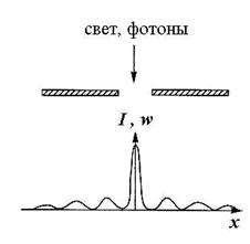 Если рассматривать свет как поток частиц (фотонов), то для фотона мы не можем определить, в какую точку на экране он попадет. Для фотона можно рассчитать только вероятность попадания его в ту или иную точку (w). И эта вероятность w ~ I ~ A 2. Чтобы реализовать эту вероятность попадания фотонов в ту или иную точку на экране, необходимо пропустить большое число фотонов через щель. То есть получается, что волновые свойства света проявляются через статистические закономерности.