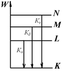 Второй тип рентгеновских лучей называют характеристическим рентгеновским излечением. Свое название оно получило вследствие того, что этот тип лучей характеризует вещество антикатода. Характеристическое рентгеновское излучение возникает при выбивании электронов из внутренних оболочек атома. На рис. 11.4 приведена схема уровней электронов атома с усредненным значением энергии оболочки. Если бомбардирующие электроны выбивают электроны, например, из К - оболочки, то вакантное место заполнят электроны из оболочки с большей энергией (электроны L, M, N оболочек). Совокупность переходов электронов из состояний с большей энергией в состояния К - оболочки приводит к появлению К – серии характеристического рентгеновского излучения. Линии этой серии принято обозначать совокупностью следующих символов: К α, К β, К γ, …