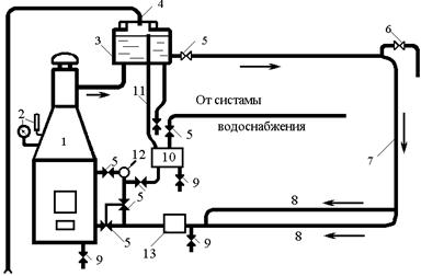 Из котла 1 горячая вода поступает в расширитель 3, который предназначен для приема избытка воды в системе, образующегося вследствие увеличения ее объема при нагревании, и для текущего восполнения потерь воды в результате испарения. Полость расширителя сообщается с атмосферой. Это способствует выходу воздуха из воды, так как скопление воздуха в трубах ухудшает циркуляцию в системе. От расширителя идут две ветви отопительных труб вдоль обеих боковых стен вагона. Каждая ветвь, отходящая от расширителя, идет поверху до противоположного конца вагона, затем спускается вниз, образуя стояки 7. От стояков понизу вдоль стен проходят обогревательные трубы 8, которые присоединяются к нижней части котла. В верхних трубах предусмотрены краны 6 для удаления воздуха. Насос 12 предназначен для питания котла водой из запасного водяного бака 10 и в необходимых случаях для усиления циркуляции воды в системе, Контрольные приборы 2 (термометр и гидрометр) служат для наблюдения за температурой и уровнем воды в котле.