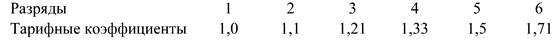 Эта форма оплаты ранее основывалась на тарифно-квалификационной системе, которая включала единую тарифную сетку и тарифно-квалификационный справочник, где устанавливались зависимости степени сложности определенных видов работ от уровня квалификации работников, имеющих право эту работу выполнять. Система тарифных ставок в недавнем прошлом устанавливалась практически для всех отраслей материального производства единой по всей стране. Сейчас эта система, во-первых, носит рекомендательный характер и, во-вторых, предусматривает не фиксированные тарифные ставки, а соотношения между ставками разных разрядов - тарифные коэффициенты. Тарифные коэффициенты для рабочих-ремонтников 1-6-го разрядов при повременной оплате труда приведены ниже: