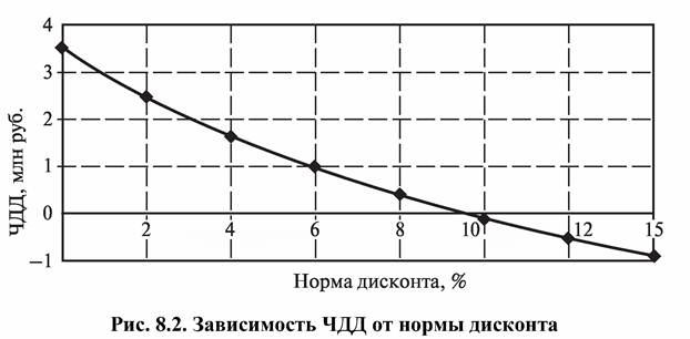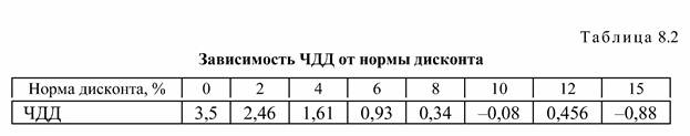 1. Графический. В соответствии с этим методом строится график ЧДД = ƒ (Е), точка пересечения этого графика с осью абсцисс (х) равна искомой величине ВНД (табл. 8.2 и рис. 8.2). Значение ВНД в этом случае составляет 10 %.
