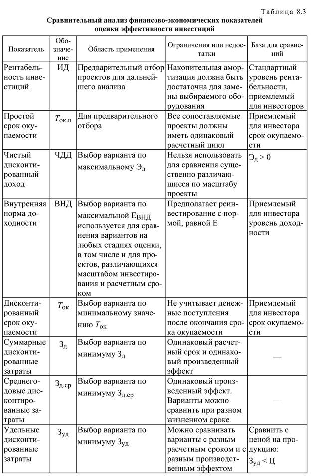 В сводной табл. 8.3 содержатся показатели оценки финансовоэкономической эффективности инвестиционных проектов с учетом фактора времени, дана характеристика области их применения и условий использования.