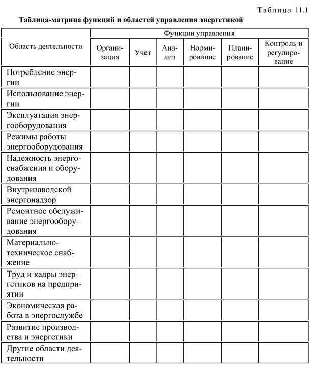 6. Контроль и регулирование:оперативное; текущее. Эти функции осуществляются в определенных областях деятельности, среди которых специфичными для энергетики являются: потребление энергии; использование энергии; эксплуатация энергетического и энергоиспользующего оборудования; режимы энергоснабжения и работы энергооборудования; надежность энергоснабжения и работы энергооборудования; внутрипроизводственный (внутри предприятия) энергонадзор. Неспецифическими областями деятельности, относящимися ко всему предприятию, однако имеющими энергетические особенности, в энергохозяйстве являются: ремонтное обслуживание энергетического и энергоиспользующего оборудования (энергоприемников технологических установок); материально-техническое снабжение энергохозяйства и всей энергетики предприятия; труд и кадры энергетиков; экономическая работа в энергохозяйстве; развитие производства и его энергетического обеспечения; другие неспецифичные области деятельности: подготовка производства, реализация и сбыт продукции и пр. На пересечении функций управления и областей деятельности находятся комплексы задач управления. Матрица управления энергетикой предприятия приведена в табл. 11.1. Для упрощения здесь не даны подфункции управления (в таблице нет, например, организации структуры, взаимоотношений, информации, видов учета - оперативного, статистического и бухгалтерского и т.п.).