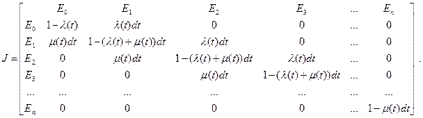 Для определения дифференциальных уравнений состояний системы массового обслуживания обозначим через J стохастическую матрицу (матрицу переходов системы из одного состояния в другое), а через Р стохастический вектор. Вероятность обозначается Рn 1 n, где n 1 – предыдущее состояние системы; n – последующее состояние системы; Р 01 = λd t обозначает вероятность возникновения в системе одной заявки.