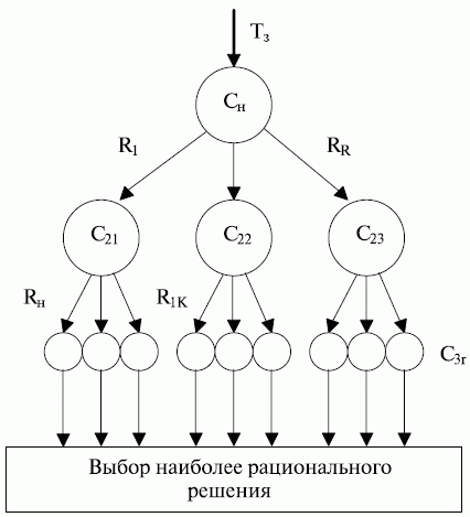 На рисунке показана модель многоуровневого процесса проектирования с выбором наиболее рационального решения на последнем уровне: ТЗ – техническое задание; Сii – операции синтеза проектных решений; Rq{k} – проектные варианты