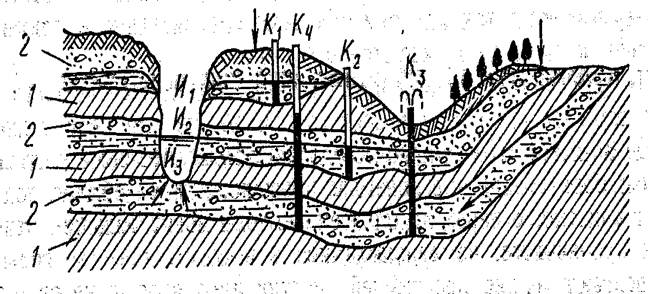 1 - водоупорные породы; 2 — водоносные породы;
