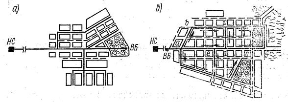 По конфигурации в плане различают водопроводные сети разветвленные, или тупиковые (рис. 2.1, а), и кольцевые, или замкнутые (рис. 2.1, б). Разветвленные водопроводные сети выполняют для небольших объектов водоснабжения, допускающих перерывы в снабжении водой. Эти сети целесообразны при сосредоточенном потреблении воды в отдаленных друг от друга точках сети. Кольцевые водопроводные сети выполняют при необходимости бесперебойного водоснабжения, что гарантируется в данном случае возможностью двухстороннего питания водой любого потребителя. Протяженность и стоимость кольцевых сетей больше, чем разветвленных.