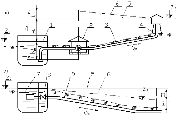 По напорным водоводам (рисунок 2.2, а) воду подают из питающего резервуара с меньшей отметки его свободной поверхности z1 в питательный резервуар на высоту z2. Для этих водоводов линия гидродинамического напора всегда будет находится выше линии гидростатического напора.