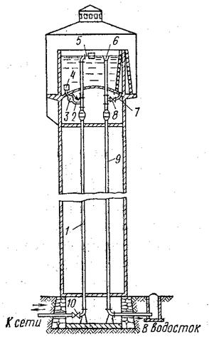 Водонапорная башня состоит из следующих основных элементов: водонапорного бака, поддерживающей конструкции (ствола) и отепляющего шатра вокруг бака. В районах с мягким климатом шатры можно не устраивать, но в этом случае бак должен иметь перекрытие. Вода в бак подается по трубе 1, заканчивающейся на уровне наибольшего наполнения. Конец ее может быть оборудован поплавковым клапаном 5, который автоматически закрывает подающую трубу при наполнении бака. Раздача воды из бака происходит по трубам 1 и 2. На трубе 2 устанавливают обратный клапан 3, препятствующий поступлению воды в бак по этой трубе. Конец трубы 2 располагают над дном бака и оборудуют сеткой 4. Трубу 1, служащую для подачи воды в бак и разбора воды из него, называют подающе-разводящей. Задвижка 10 служит для отключения водонапорной башни от сети. Для подачи воды в бак и разбора воды из него могут выполняться отдельные трубы.