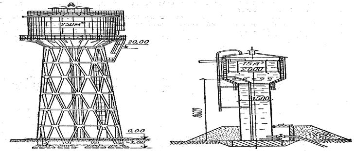| Рис. 2.7. Железобетонная водонапорная башня с опорой из сборных элементов | Рис. 2.8. Бесшатровая сборно-металлическая водонапорная башня (конструкция инж. А. А. Рожневского) |