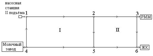 2). В каждом замкнутом контуре сумма потерь напора на участках, по которым происходит движение по часовой стрелки (положительны), равны сумме потерь напора на участках, на которых вода движется против часовой стрелки (отрицательны).