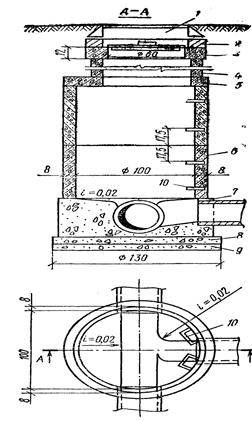 На рис. 5.6 показан простейший узловой канализационный колодец. Он состоит из основания (подготовки и плиты), цилиндрической рабочей камеры и горловины.