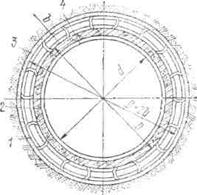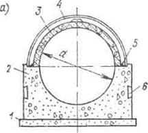 | Рис. 5.7. Коллектор, выполняемый при открытом способе производства работ 1 - подготовка; 2 - бетонное основание из сборных элементов; 3 - свод; 4 - бетонный пояс для заделки стыков свода; 5 - битум; 6 - железобетонный пояс для крепления блоков основания | Рис. 5.8. Коллектор, выполняемый при щитовом способе производства работ 1 - керамические или бетонные блоки; 2 - железобетонная рубашка; 3 - цементный раствор, нагнетаемый за блок; 4 - штукатурка с железпением поверхности |