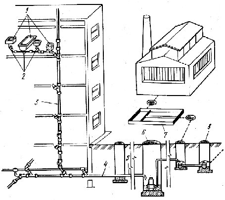 3 – внутренняя канализационная сеть; 4 – выпуск; 5 – дворовая канализационная сеть;