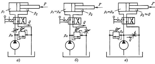 Кроме описанной выше схемы установки дросселя на входе в гидродвигатель, возможны также схемы установки на выходе или параллельно (рис. 4.5, б, в). В случае установки дросселя параллельноснизижаются энергетические потери в гидроприводе (масло через предохранительный клапан может проходить лишь при перегрузке или остановке гидроцилиндра на упоре, если дроссель не пропускает всего потока масла, нагнетаемого насосом, при давлении настройки предохранительного клапана).
