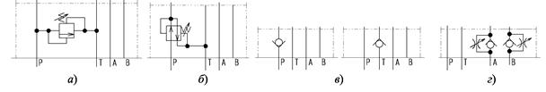 Рис. 4.6. – Типовые схемы аппаратов модульного исполнения: а) клапана предохранительного (на D y = 6 мм); б) клапана редукционного (на D y = 6 мм); в) клапана обратного; г) дросселя.