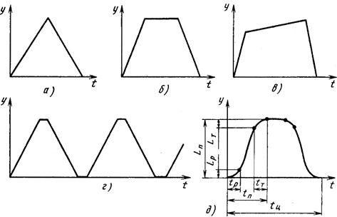 Рис. 9.1. – Примерные циклограммы двухпозиционных приводов: а) «прямой ход – обратный ход – остановка»; б) «прямой ход – выстой – обратный ход – остановка»; в) «быстрый подвод – рабочий ход – обратный ход – остановка»; г) периодическое возвратно-поступательное (поворотное) движение; д) «прямой ход – выстой – обратный ход – остановка» с выделенными зонами разгона и торможения; L п и t п – полный ход и время выходного звена; L р и t р – перемещение и время при разгоне; L т и t т –при торможении; t ц – полное время цикла