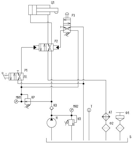 Рабочая жидкость от насоса по напорному трубопроводу поступает в поршневую полость цилиндра Ц1, шток которого выдвигается до тех пор, пока кулачек, закрепленный на нем не нажмет на кулачек распределителя Р3. Через распределитель Р3 управляющий сигнал поступит на правый торец распределителя Р2, который переключится в правое положение, и жидкость будет поступать в штоковую полость цилиндра Ц1. При этом выходное звено цилиндра (шток) совершит обратный ход до остановки.