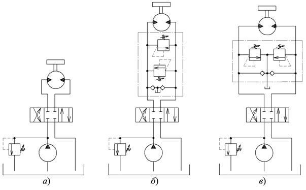 Рис. 10.1. – Схемы гидроприводов без клапанного блока (а) и склапанными блоками (б и в)