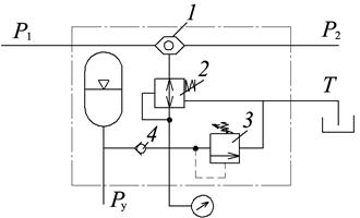 Блок питания (рис. 10.5) состоит из логического элемента «или» (т.к. может применяться в двух насосных гидросистемах) 1, редукционного клапана 2, предохранительного клапана 3, обратного клапана 4 и гидропневмоаккумулятора. Зарядка гидропневмоаккумулятора происходит после запуска двигателя в течении непродолжительного времени до давления 3 МПа.