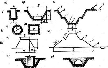 1 - поперечный профиль выемок: а - траншея прямоугольного профиля; 6 - котлован (траншея) трапецеидальной формы; в - профиль постоянной выемки; 1 - бровка откоса; 2 - откос; 3 - берма 4 - основание откоса; 5 - дно откоса; 6 - банкет; 7 - нагорная канава; II - сечения подземных выработок: г - круглое; д - прямоугольное; III - профили насыпи: е - временной насыпи; ж -постоянной; IV - обратная засыпка: з - пазух котлована; и – траншеи