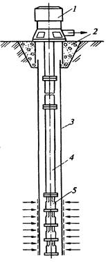 Рис. 2.2. Схема скважины-колодца: 1 - привод насоса; 2 - обсыпка; 3 - фильтровая колонна; 4 - водоподъемная труба; 5 - насос