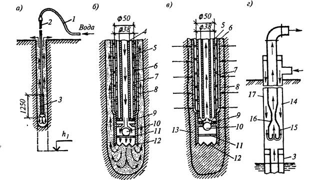 а - общий вид; б - период погружения иглофильтрового звена в грунт; в - период водопонижения; г - эжекторный иглофильтр; 1 - гибкий шланг; 2 - надфильтровая труба; 3 - иглофильтровое звено; 4 - внутренняя труба; 5 - наружная перфорированная труба; 6 - спиральная обмотка; 7 -фильтрационная сетка; 8 - стальная защитная сетка, 9 - кольцевой клапан; 10 - шаровой клапан; 11 – ограничитель; 12 - зубчатый наконечник; 13 - песчано-гравийная смесь; 14 - наружная труба эжектора; 15 - насадка эжектора; 16 - суженный участок трубы; 17 - зона разрежения
