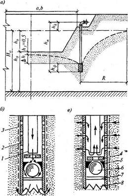 Рис. 2.4. Водопонижение иглофильтровой установкой: а - схема установки; 6 - иглофильтр при гидроподмыве; в - то же, при откачке воды; 1- внутренняя труба; 2- внешняя труба; 3 - фильтрующая сетка; 4 - кольцевой клапан; 5 - седло; 6 -шаровой клапан; 7 - ограничитель; 8 - наконечник | коэффициенте фильтрации 2...60 м/сут расстояние принимают в пределах 1...1,5 м, в сильно фильтрующих крупнопесчаных и песчано-гравелистых грунтах расстояние сокращают до 0,75 м. Иглофильтровая установка состоит из ряда иглофильтров, погружаемых в грунт по периметру будущего котлована, по одной или двум сторонам траншеи. На поверхности земли иглофильтры присоединяют водосборным коллектором к насосной установке. При работе насосов в режиме откачки воды благодаря дренирующим свойствам грунта уровень воды в иглофильтре и окружающих грунтовых слоях понижается, что приводит к образованию нового УГВ, который называется депрессионной кривой. Вакуумный способ водопонижения основан на использовании эжекторных водопонизительных установок. Эти установки используют для понижения уровня грунтовых вод в мелкозернистых грунтах (мелкозернистые и пылеватые пески, супеси, илистые и лессовые грунты с коэффициентом фильтрации 0,02... 1 м/сут), в которых применять легкие иглофильтровые установки нецелесообразно. При работе вакуумных водопонизительных установок вакуум возникает в зоне эжекторного иглофильтра (рис. 2.3, г). Эжекторная установка применима для понижения уровня грунтовых вод одним |