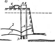 Рис. 2.2. Схема скважины-колодца: 1 - привод насоса; 2 - обсыпка; 3 - фильтровая колонна; 4 - водоподъемная труба; 5 - насос | Насосы подбирают в зависимости от дебита (притока) вод, а сам дебит рассчитывают по формулам установившегося движения грунтовых вод. Водосборные канавы устраивают шириной по дну 0,3...0,6 м и глубиной 1...2 м с уклоном 0,01...0,02 м в сторону приямков. Сами приям![]() ![]() ![]() ![]() ![]() ки в устойчивых грунтах крепят в виде деревянного сруба без дна, а в оплывающих грунтах еще и шпунтовой стенкой. Открытый водоотлив является простым и доступным способом борьбы с грунтовыми водами, но имеет серьезный технологический 4едостаток. Восходящие потоки грунтовой воды, протекающей через стенки и дно котлованов и траншей, разжижают грунт и выносят из нeгo на поверхность мелкие частицы. В результате такого вымывания этот способ имеет ряд существенных недостатков: ■ снижается естественная прочность основания выемки за счет размыва его проточной водой; ■ наличие воды на дне выемки затрудняет разработку грунта; ■ требуется крепление стенок выемок, так как движение воды к зумпфам приводит в движение и грунты; ■ подток воды к водосборной канаве может вызвать ослабление оснований зданий и сооружений, расположенных рядом со строящимся объектом. В тех случаях, когда водоотлив оказывается нецелесообразным, три меняют искусственное понижение уровня грунтовых вод (водопонижение). |