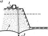 Водопонижение обеспечивает снижение уровня грунтовых вод (УГВ) ниже дна будущей выемки. Понижение уровня грунтовых вод состоит в откачке грунтовых вод глубинными насосами из шахтных колодцев (рис. 2.2) или буровых водопонижающих сква-жин расположенных в непосредственной близости от будущего котлована или траншеи. При этом УГВ резко понижается, ранее насыщенный водой грунт и теперь обезвоженный, разрабатывается как грунт естественной влажности. При водопонижении появляется возможность сохранять в целостности откосы выемок и предотвращать вынос частиц грунта из-под фундаментов ближайших зданий.
