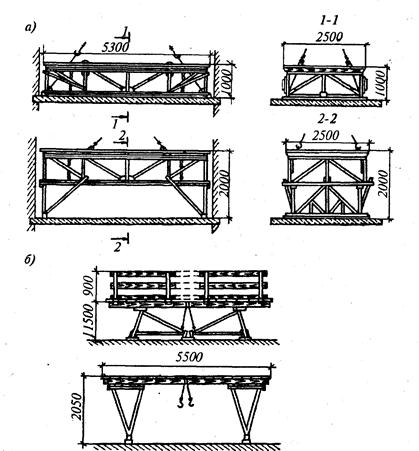 Рис. 12.6. Подмости для каменной кладки: а - инвентарные блочные подмости; б - шарнирно-панельные подмости