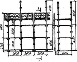 1-1 ![]() Рис. 12.7. Леса для каменной кладки: а - трубчатые безболтовые; 6 - безболтовое соединение; в - болтовое соединение; / - стойка; 2 -ригель; 3 - крюк, приваренный к ригелю; 4 - патрубки, приваренные к стойке ригеля | При установке первого ряда стоек на землю или асфальт укладывают прокладки или подкладки, на них инвентарные башмаки, в отверстие которых вставляют стойки. По ходу каменной кладки стойки трубчатых лесов наращивают, связывают ригелями и перекладывают с нижних ярусов настил. Леса могут иметь высоту до 40 м. Трубчатые болтовые леса также состоят из стоек и прогонов. Стойки между собой соединяют с помощью втулок, а ригели со стойками - хомутами на болтах, что |