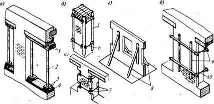 а - простенков разгрузочными стойками; б - столбов и простенков стальной обоймой; в - то же, инвентарными хомутами; г - отдельно стоящих стен двусторонними подкосами; д - высоких простенков двусторонними сжимами; 1 - доска; 2 — стойка; 3 - клинья; 4 — деревянная подкладка; 5 - стальной уголок; б — стяжной болт; 7 - хомуты со стяжными болтами; 8 — подкосы; 9 — бревна; 10 - проволочные скрутки