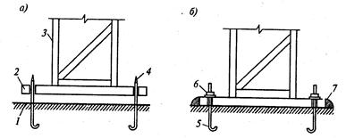 | Рис. 17.1. Схема установки (а) и постоянного закрепления (б) металлической колонны на опоре: 1 - фундаментная плита; 2 – опор-ная плита (башмак); 3 - колонна; 4 - колпачок для сохранения резьбы при монтаже; 5 - анкер; б - гайка; 7 – сварка |