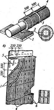 | Рис. 20.4. Изоляция минераловатными прошивными матами: а-трубопроводов; б- плоских поверхностей; 1- минераловатные маты; 2-проволочная подвеска; 3-бандаж; 4- сшивка проволокой; 5- установленные и закрепленные штыри; 6 - штыри после навески изоляционного слоя |