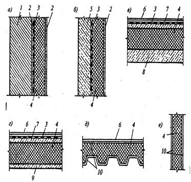 | Рис. 20.6. Схемы ограждения конструкций холодильников: а — кирпичная стена; 6 — стена из керамзитобетонных панелей; в- железобетонное безбалочное пок-рытие; г- железобетонное покры-тие из ребристых плит; д- па-нельное покрытие; е- стены из трехслойных панелей с метали-ческой облицовкой и трудно сгораемым утеплителем; 1- Кир-пичная кладка; 2- штукатурка или гипсокартонные листы; 3- парои-золяционный слой; 4- теплоизо-ляционный слой; 5- керамзитобе-тонная панель; 6-кровельный ко-вер с защитным слоем; 7-армиро-ванная бетонная стяжка; 8-желе-зобетонная плита перекрытия, δ = 160 мм; 9- то же, δ = 30 мм; 10- металлическая облицовка |