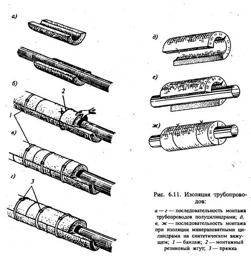 Изоляцию трубопроводов полуцилиндрами и цилиндрами из минеральной ваты выполняют на синтетическом вяжущем (рис.20.7. 6.11). Полуцилиндры и цилиндры устанавливают с подгонкой по месту с заделкой швов и закрепляют бандажами. Бандажи применяют из стальной ленты или проволоки. Изделия закрепляют на трубопроводе на синтетическом вяжущем со смещением поперечных швов.