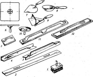 | Рис. 9.1. Ручной инструмент для штукатурных работ: 1-кисть-макловица;2- правило; 3- усеночное правило; 4- лузговое правило; 5- терка; 6- штукатурный сокол; 7 -штукатурная лопатка; 8-штукатурный ковш; 9-совок с качающейся ручкой; 10- тарельчатый сокол; 11- полутерок; 12- гладилка |