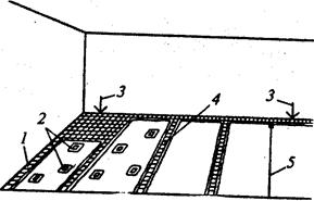 1- фризовой маячный ряд; 2 – промежуточные вспомога-тельные маяки; 3— реперный маяк на стене;4- маячные ряды; 5 — шнур-причалка для укладки маячного ряда плиток