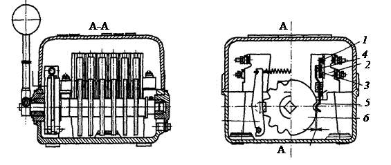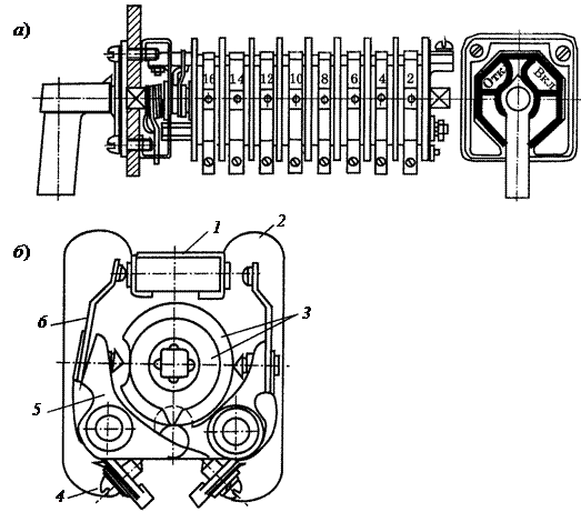 Рис. 2.7. Кулачковый контроллер: 1 – неподвижные контакты; 2 – контактодержатель; 3 – подвижные контакты; 4 – пружина; 5 – рычаг; 6 – переключающая шайба; 7 – фиксатор