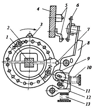 Рис. 2.8. Контактный элемент кулачкового контроллера: 1 – валик; 2 – переключающая шайба; 3 – кулачек; 4 – плата; 5 – неподвижные контакты; 6 – подвижные контакты; 7 – кулачек; 8 – поворотный рычаг; 9 – ролик; 10 – пружина; 11 –ролик; 12 – защелка; 13 – пружина