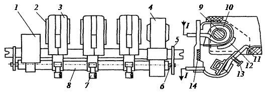 Для управления трехфазными электродвигателями переменного тока широко применяются контакторы поворотного типа серии КТ6000 с щелевыми дугогасительными камерами и магнитным дутьем и КТ7000 с дугогасительными решетками для тяжелых режимов работы в цепях переменного тока. На рис. 3.7 показана конструктивная схема контактора КТ6000. На металлической рейке 14 крепятся узлы неподвижных контактов 12 вместе с системами магнитного дутья – катушкой 10, сердечником 9. Боковыми стальными пластинами 2 и дугогасительными камерами 3. На рейке 14 установлены сердечник электромагнита, неподвижная часть вспомогательных контактов 1 и крепятся опоры подшипников 5 для главного вала 6. Наружная часть вала 8 изолирована, на нем установлены подвижные контакты 11 с контактными пружинами 13 и гибкими связями 7 (три полюса), подвижная часть вспомогательных контактов 1 и якорь электромагнита 4.