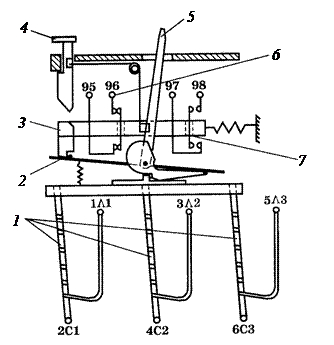 При возникающей перегрузке ток, проходя по нагревателю теплового реле, нагревает биметаллическую пластинку 7, которая изгибается и действует на рычаг 5, рычаг приподнимает защелку 4, защелка освобождается и при этом под действием пружины 2 контакты 1 выключателя размыкаются.