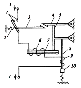 При коротком замыкании электромагнит 9 электромагнитного расцепителя мгновенно втягивает сердечник 10 и толкателем 8 воздействует на рычаг 5 – происходит автоматическое отключение выключателя.