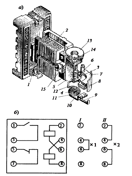 а) – общий вид (1 – магнитопровод; 2 – катушки; 3 – подвижный контактный мостик; 4 – пружина; 5 – якорь; 6 – неподвижные контакты; 7 – изолированная колодка; 8 – шкала; 9 – указатель; 10 – пружинодержатель; 11 – втулка; 12 – хвостовик; 13 – гаситель колебаний; 14 – ось; 15 – упоры); б) – схемы соединения обмоток реле