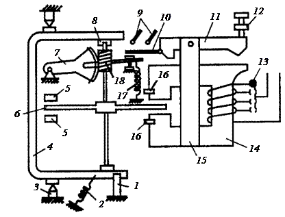 Индукционный элемент состоит из электромагнита 14 с короткозамкнутыми витками 16 и диска 6, ось которого находится в подшипниках 8, установленных на рамке 4. Рамка поворачивается на осях 3 и пружиной 2 удерживается в крайнем положении, т.е. пружиной к упору 1. На ось диска насажен червяк 18. В исходном положении рамки сегмент 7, имеющий червячные зубья, не находится в зацеплении с червяком и контакты 9 реле разомкнуты.