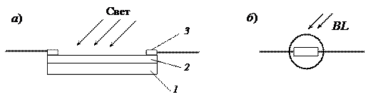 Фоторезистор (рис. 8.6, а) представляет собой стеклянную пластинку 1, на которую путем напыления в вакууме нанесен тонкий слой полупроводника 2, а по краям выведены два металлических электрода 3. При изготовлении полупроводниковый слой покрывается прозрачным лаком для защиты от влаги и механических повреждений. Пластинку помещают в корпус с двумя выводами.